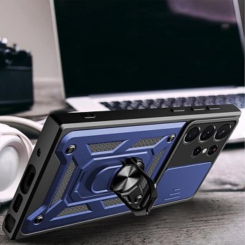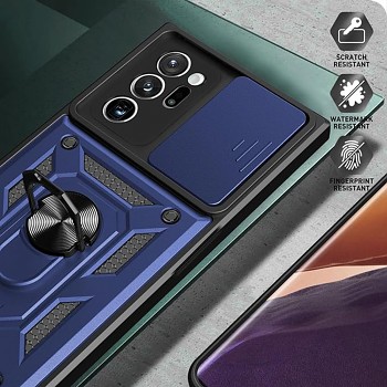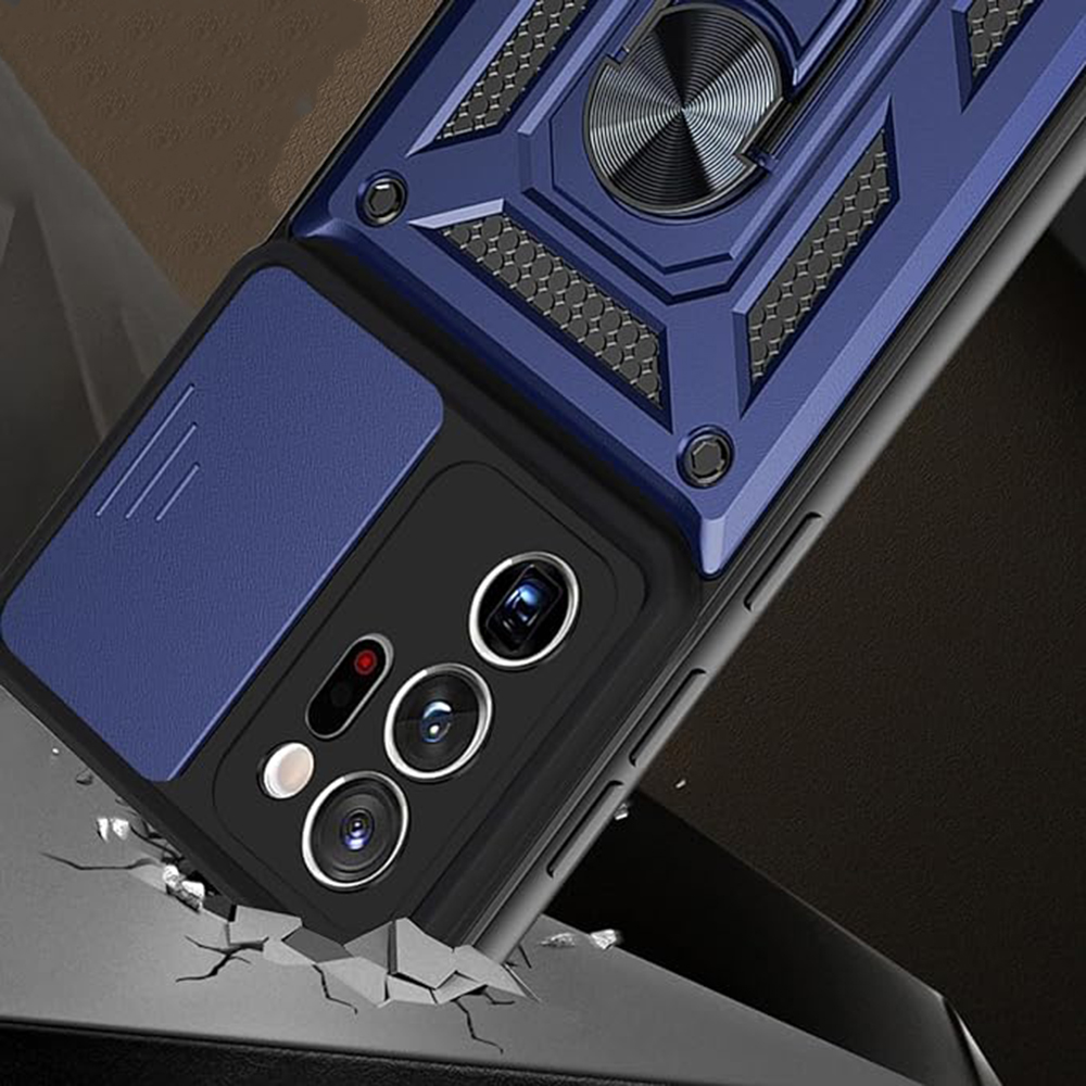 Kryt Techsuit CamShield Series se pyšní robustním a moderním designem, který okamžitě upoutá pozornost. Jeho černá barva dodává telefonu sofistikovaný vzhled, zatímco texturované panely na zadní straně zajišťují pevný a jistý úchop, čímž minimalizují riziko vyklouznutí z ruky. Dominantním prvkem je integrovaný posuvný kryt fotoaparátu (CamShield), který spolehlivě chrání čočky před poškrábáním a nečistotami, když je nepoužíváte. Na zadní straně naleznete také praktický otočný kroužek, který slouží jako stojánek pro pohodlné sledování obsahu nebo jako bezpečný úchyt. Díky integrované kovové destičce je kryt navíc kompatibilní s magnetickými držáky do auta, což zvyšuje jeho praktičnost. Všechny výřezy pro konektory, mikrofony, reproduktory a fotoaparáty jsou precizně zpracované, což zaručuje neomezený přístup a plnou funkčnost telefonu. Tlačítka mají jistý stisk a přístup k nabíjecímu portu je vždy bezproblémový.