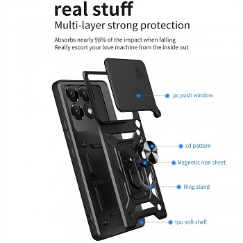 Pouzdro Techsuit CamShield Series se vyznačuje robustním a promyšleným designem, který kombinuje estetiku s maximální funkčností. Jeho modré provedení s výraznými geometrickými texturami na zadní straně a bocích nejen skvěle vypadá, ale také zlepšuje úchop a minimalizuje riziko vyklouznutí telefonu z ruky. Integrovaný posuvný kryt fotoaparátu (CamShield) spolehlivě chrání čočky před poškrábáním a nečistotami, když je nepoužíváte, a zajišťuje tak jejich dlouhodobou kvalitu. Dalším praktickým prvkem je otočný kovový kroužek na zadní straně, který slouží jako bezpečný držák pro pohodlné ovládání jednou rukou nebo jako praktický stojánek pro sledování videí. Zesílené rohy a zvýšené okraje kolem displeje poskytují dodatečnou ochranu proti pádům a nárazům.