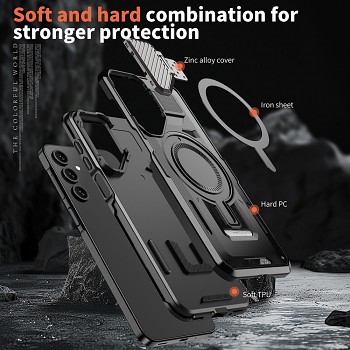 Kryt Techsuit CamVault MagSafe se pyšní robustním a funkčním designem, který klade důraz na ochranu a praktičnost. Je vyroben z kombinace měkkého TPU a tvrdého PC, doplněného o kryt ze slitiny zinku a železný plech pro MagSafe kompatibilitu, což zajišťuje silnější ochranu proti pádům a nárazům. Zadní strana a boky krytu jsou opatřeny texturovaným povrchem, který zlepšuje úchop a minimalizuje riziko vyklouznutí telefonu z ruky. Integrovaný posuvný kryt fotoaparátu (CamVault) nejenže chrání citlivé čočky před poškrábáním a nečistotami, ale zároveň slouží jako praktický stojánek pro pohodlné sledování videí či videohovory.