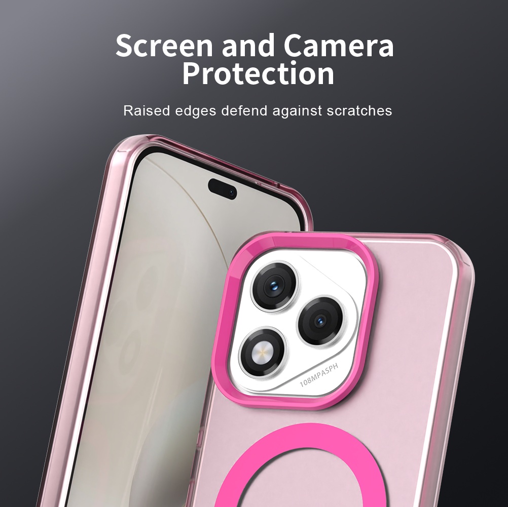 Kryt Techsuit CandyCase MagSafe se pyšní průhledným designem s jemným růžovým nádechem, který nechá vyniknout originální krásu vašeho Honor 400 Lite. Okraje krytu a výrazný prstenec kolem modulu fotoaparátu jsou provedeny v sytějším růžovém odstínu, což dodává pouzdru moderní a hravý vzhled. Integrovaný MagSafe prstenec na zadní straně zajišťuje perfektní kompatibilitu s MagSafe příslušenstvím, což umožňuje snadné a bezpečné připevnění nabíječek, peněženek a dalších doplňků. Díky přesným výřezům pro konektory, mikrofony, reproduktory a fotoaparáty je zajištěna plná funkčnost telefonu bez jakéhokoli omezení. Tlačítka mají jistý stisk a jsou snadno přístupná, což zaručuje pohodlné používání každý den.