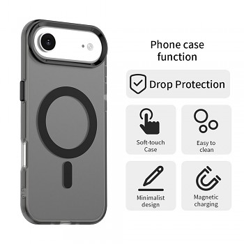 CandyCase MagSafe se pyšní minimalistickým a zároveň robustním designem. Kryt je vyroben z průsvitného černého materiálu, který decentně podtrhuje originální barvu vašeho telefonu a zároveň mu dodává elegantní "kouřový" vzhled. Na zadní straně je integrován výrazný černý MagSafe kroužek, který zajišťuje perfektní kompatibilitu s MagSafe příslušenstvím a bezdrátovým nabíjením. Oblast kolem fotoaparátu je precizně ohraničena a zvýšena pro maximální ochranu objektivů. Všechny ovládací prvky jsou chráněny, ale zůstávají snadno dostupné a citlivé na dotyk, což zaručuje bezproblémové používání.