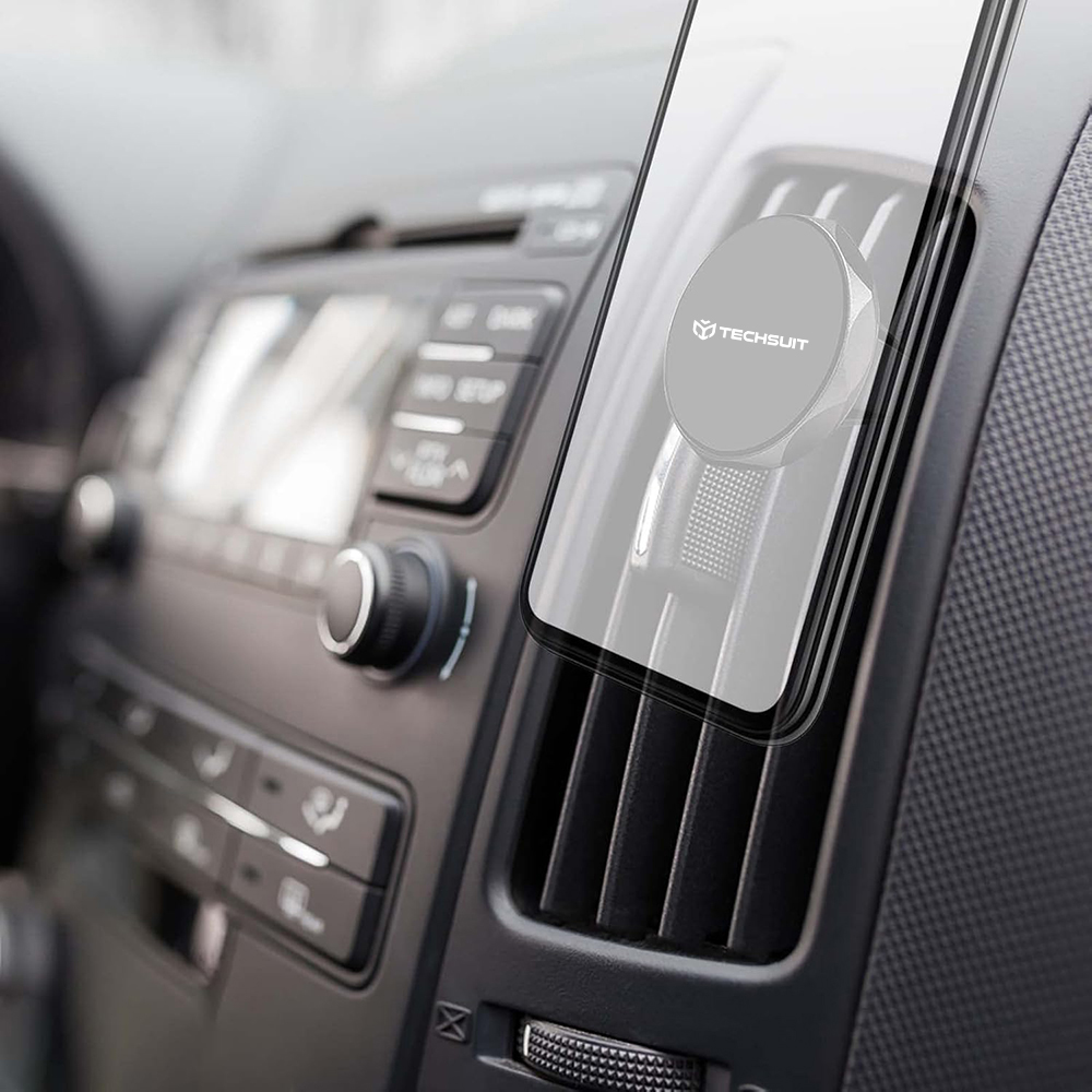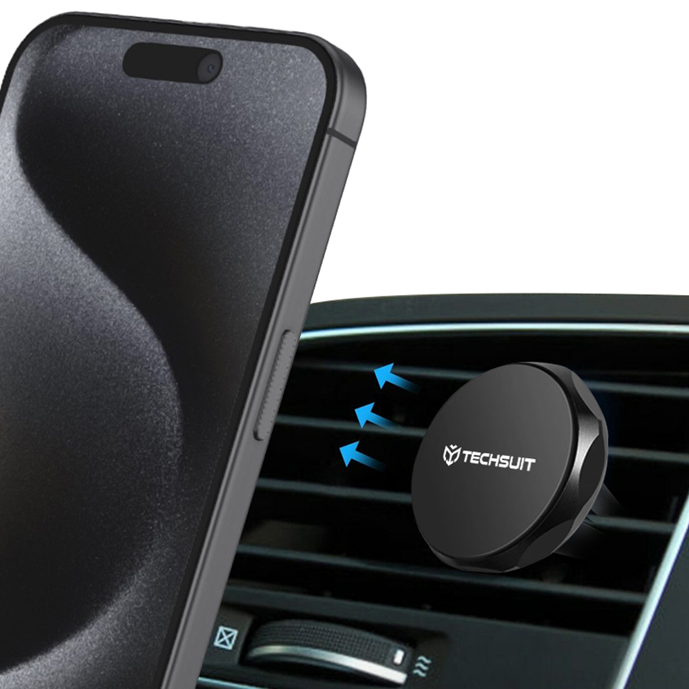 Techsuit Car Holder TinyGrip S9 do ventilace s kovovou destičkou silný magnet univerzální kompatibilita černá stříbrnáPředstavujeme Techsuit Car Holder TinyGrip S9, elegantní a vysoce funkční magnetický držák do automobilu, který se stane nepostradatelným doplňkem pro každého řidiče. Tento držák je navržen pro maximální pohodlí a bezpečnost během jízdy, umožňuje snadné a rychlé upevnění vašeho telefonu na dosah ruky.