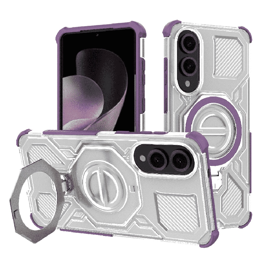 Pouzdro Techsuit Carbon Shield PRO se pyšní dvouvrstvou konstrukcí, která poskytuje maximální odolnost proti nárazům a pádům. Vnitřní vrstva je vyrobena z fialového průhledného TPU, který absorbuje otřesy a chrání telefon před poškrábáním. Vnější pevná skořepina v elegantní stříbrno-šedé barvě s texturou připomínající karbonová vlákna dodává pouzdru futuristický a zároveň robustní vzhled. Zesílené rohy zajišťují extra ochranu v nejkritičtějších místech. Integrovaný otočný kroužek na zadní straně slouží jako praktický stojánek pro sledování obsahu nebo jako bezpečný úchyt pro pohodlné držení telefonu. Přesné výřezy pro konektory, mikrofony, reproduktory a fotoaparáty zaručují plnou funkčnost vašeho zařízení bez omezení. Tlačítka jsou kryta, ale zachovávají si jistý a citlivý stisk.