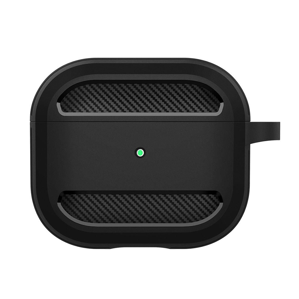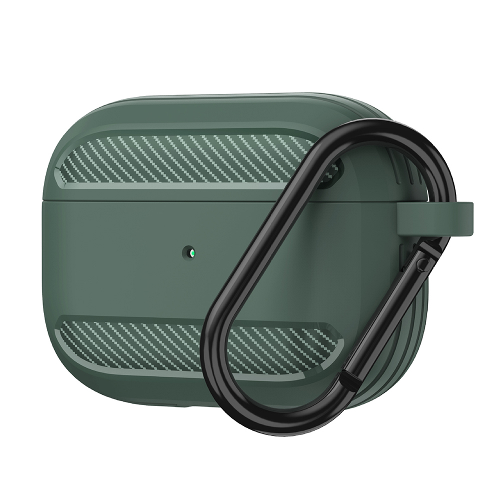 Pouzdro Techsuit Carbon Silicone se pyšní robustním a zároveň flexibilním designem. Jeho povrch je tvořen kombinací hladkého silikonu a výrazné textury imitující karbonová vlákna, která je umístěna na horní a spodní části přední strany, stejně jako po bocích pouzdra. Tato textura dodává pouzdru dynamický a sportovní vzhled. Sytě zelená barva podtrhuje jeho moderní estetiku a zajišťuje, že vaše AirPods 3 budou vždy vypadat stylově. Součástí balení je také praktická černá karabina, díky které můžete pouzdro snadno připevnit k batohu, klíčům nebo opasku a mít tak sluchátka vždy po ruce a v bezpečí.