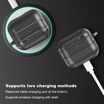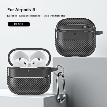 Pouzdro se pyšní robustní konstrukcí s vnější vrstvou imitující karbonové vlákno, což mu propůjčuje nejen atraktivní texturu, ale i zvýšenou odolnost. Středová část, kde jsou uložena sluchátka, je vyrobena z hladkého, matného černého materiálu, který doplňuje celkový design. Precizní výřezy zajišťují snadný přístup k nabíjecímu portu a umožňují viditelnost LED indikátoru stavu nabíjení. Součástí balení je také praktická kovová karabina, díky které můžete pouzdro snadno připevnit k batohu, klíčům nebo opasku a mít tak svá AirPods vždy po ruce a v bezpečí.