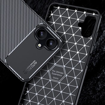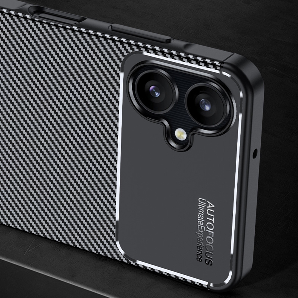 Pouzdro se pyšní sofistikovaným černým provedením. Zadní strana je rozdělena na dvě části: spodní dvě třetiny zdobí elegantní textura imitující karbonová vlákna, která dodává pouzdru sportovní a zároveň luxusní vzhled. Horní třetina je hladká, matně černá, s precizními výřezy pro duální fotoaparát a blesk. V této části je decentně umístěn nápis "AUTO FOCUS Ultimate Experience", který podtrhuje technologický charakter pouzdra. Zvýšené okraje kolem fotoaparátu a displeje zajišťují dodatečnou ochranu proti poškrábání při položení na rovný povrch. Pouzdro je vyrobeno z kvalitního a odolného materiálu, který efektivně absorbuje nárazy a chrání telefon před poškozením.