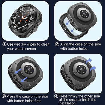 Design pouzdra Techsuit Defense360 Pro je promyšlený do posledního detailu. Jeho robustní, ale zároveň elegantní provedení dokonale doplňuje vzhled vašich Samsung Galaxy Watch Ultra (47mm). Pouzdro je navrženo jako "3 v 1" řešení, které kombinuje plné pokrytí rámu z PC materiálu s integrovaným tvrzeným sklem, čímž poskytuje víceúrovňovou ochranu. Instalace je jednoduchá a intuitivní, což umožňuje rychlé a bezpečné nasazení pouzdra na hodinky.