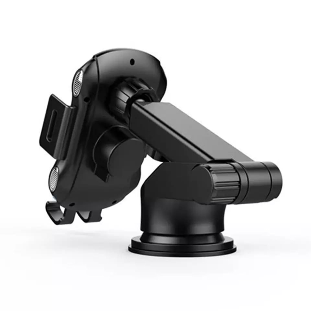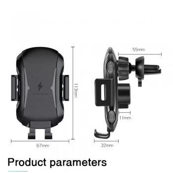 Držák se pyšní moderním a minimalistickým designem v elegantní černé barvě, která se skvěle hodí do interiéru každého vozu. Jeho robustní konstrukce z kvalitního plastu zajišťuje dlouhou životnost a odolnost. Plocha pro uložení telefonu je opatřena texturovaným povrchem pro lepší přilnavost a ochranu vašeho zařízení. Na nabíjecí ploše je decentně vyobrazen symbol blesku a nápis "Wireless Charging", což jasně indikuje jeho pokročilé funkce.