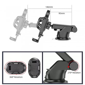 Upevnění držáku je mimořádně stabilní díky silné přísavce, kterou lze umístit jak na palubní desku, tak na čelní sklo. Přísavka je navržena pro opakované použití a udržuje si svou přilnavost i po opakovaném přemístění. Pro dokonalé nastavení úhlu pohledu je držák vybaven otočným kloubem s rozsahem 360° pro samotný držák telefonu a nastavitelným ramenem s rotací 270°, což umožňuje optimální polohování telefonu v jakékoli situaci. Rameno je navíc výsuvné, což dále zvyšuje možnosti přizpůsobení.
