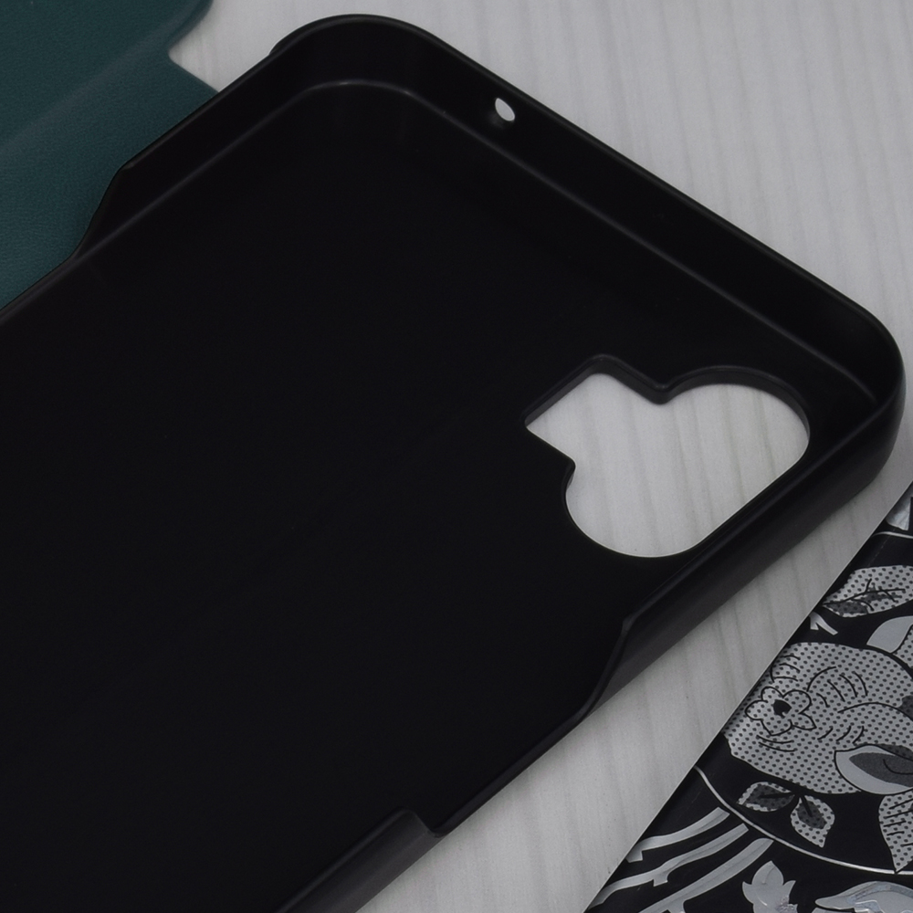Toto flipové pouzdro v tmavě zelené barvě se vyznačuje sofistikovaným designem a praktickými funkcemi. Vnější strana je vyrobena z kvalitního materiálu s jemnou texturou, která je příjemná na dotek a zároveň zvyšuje odolnost proti poškrábání a opotřebení. Dominantním prvkem je průhledný vertikální proužek na přední straně, který umožňuje rychlý náhled na čas a notifikace bez nutnosti otevírat pouzdro. Váš telefon je bezpečně usazen v precizně tvarované vnitřní vaničce z pružného materiálu, která absorbuje nárazy a chrání hrany zařízení. Pouzdro je navrženo tak, aby se dalo složit do praktického stojánku, což oceníte při sledování videí nebo videohovorech. Všechny výřezy pro konektory, mikrofony, reproduktory a fotoaparáty jsou přesné a funkční, stejně jako tlačítka, která si zachovávají jistý stisk.