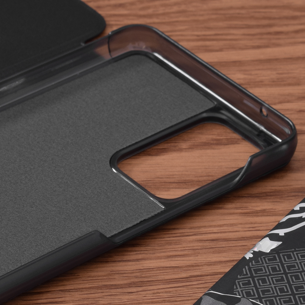 Pouzdro Techsuit eFold series se vyznačuje sofistikovaným designem s texturovaným povrchem, který imituje kůži a dodává telefonu luxusní vzhled i příjemný pocit na dotek. Jeho černá barva podtrhuje eleganci a univerzálnost. Jedním z klíčových prvků je průhledný vertikální pruh na přední straně, který umožňuje snadný náhled na čas a notifikace bez nutnosti otevírat pouzdro. Díky promyšlené konstrukci lze pouzdro využít i jako praktický stojánek pro pohodlné sledování videí nebo videohovory. Všechny výřezy pro konektory, mikrofony, reproduktory a fotoaparáty jsou precizně zpracované, což zajišťuje plnou funkčnost telefonu bez jakéhokoli omezení. Tlačítka mají jistý stisk a přístup k nabíjecímu portu je vždy bezproblémový.