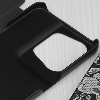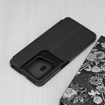 Pouzdro se vyznačuje precizním zpracováním a minimalistickým designem. Jeho povrch je jemně texturovaný, což zajišťuje příjemný úchop a zároveň dodává pouzdru luxusní vzhled. Na přední straně je integrován průhledný vertikální pruh, který umožňuje rychlý náhled na důležité informace, jako je čas a datum, aniž byste museli pouzdro otevírat. Díky promyšlené konstrukci lze pouzdro snadno složit do praktického stojánku, ideálního pro sledování videí nebo videohovory.