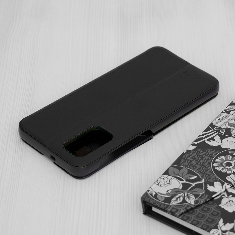 Pouzdro Techsuit eFold Series se pyšní minimalistickým a moderním vzhledem. Jeho povrch je vyveden v černé barvě s jemnou texturou, která připomíná kůži a dodává pouzdru luxusní nádech. Na přední straně se nachází průhledný vertikální pruh, který umožňuje rychlý náhled na čas, datum a notifikace, aniž byste museli pouzdro otevírat. Díky preciznímu zpracování a tenkému profilu pouzdro dokonale obepíná telefon a zachovává jeho elegantní linie. Navíc jej lze snadno složit do praktického stojánku pro pohodlné sledování obsahu.