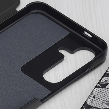 Pouzdro Techsuit eFold Series se pyšní minimalistickým a sofistikovaným designem v klasické černé barvě. Vnější povrch je vyroben z kvalitního materiálu s jemnou texturou, která připomíná kůži a zajišťuje příjemný pocit na dotek i pevný úchop. Jedním z klíčových prvků je průhledný vertikální pruh na přední straně, který umožňuje rychlý náhled na čas, datum a důležité notifikace, aniž byste museli pouzdro otevírat. Vnitřní strana pouzdra je opatřena měkkou podšívkou, která chrání displej telefonu před poškrábáním. Pouzdro je navrženo tak, aby sloužilo i jako praktický stojánek, což oceníte při sledování videí nebo videohovorech. Díky přesným výřezům pro fotoaparát, nabíjecí port a reproduktory je zajištěna plná funkčnost telefonu bez jakéhokoli omezení. Tlačítka jsou kryta, ale zachovávají si jistý a citlivý stisk.