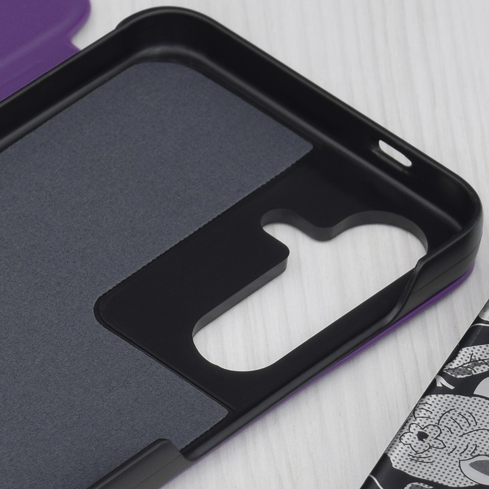 Pouzdro Techsuit eFold Series se pyšní promyšleným designem typu "flip cover", který obepíná telefon ze všech stran a poskytuje mu komplexní ochranu. Vnější strana je vyrobena z kvalitního materiálu s jemnou texturou v sytě fialové barvě, která je příjemná na dotek a zároveň odolná proti poškrábání. Charakteristickým prvkem je průhledný vertikální pruh na přední straně, který umožňuje rychlý náhled na čas a notifikace, aniž byste museli pouzdro otevírat. Vnitřní strana pouzdra je opatřena měkkou podšívkou, která chrání displej telefonu před poškrábáním. Telefon je bezpečně usazen v přesně tvarované vaničce z odolného TPU materiálu, která absorbuje nárazy a zajišťuje perfektní stabilitu. Díky funkci "eFold" lze pouzdro snadno složit do praktického stojánku, ideálního pro sledování videí nebo videohovory.