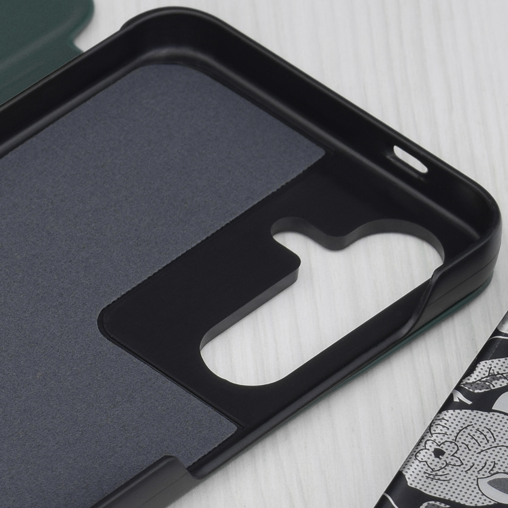 Pouzdro Techsuit eFold Series se pyšní elegantním flipovým designem v syté tmavě zelené barvě, která dodá vašemu telefonu nádech luxusu. Vnější povrch má jemnou texturu imitující kůži, což zajišťuje příjemný pocit na dotek a zároveň zabraňuje vyklouznutí z ruky. Klíčovým prvkem je průhledný vertikální pruh na přední straně, který umožňuje snadný náhled na čas, datum a notifikace bez nutnosti otevírat pouzdro. Váš telefon je bezpečně usazen v přesně tvarované vnitřní vaničce z TPU/silikonu, která absorbuje nárazy a chrání hrany zařízení. Pouzdro lze navíc snadno složit do praktického stojánku, ideálního pro sledování videí nebo videohovory.