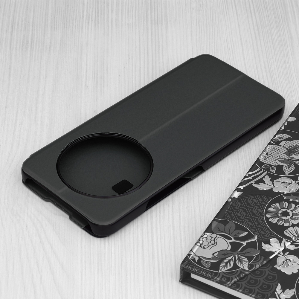 Pouzdro Techsuit eFold Series se pyšní minimalistickým a zároveň moderním vzhledem. Jeho povrch je vyveden v elegantní černé barvě s jemnou texturou, která připomíná kůži a zajišťuje příjemný pocit na dotek i bezpečný úchop. Klíčovým prvkem je průhledný vertikální proužek na přední straně, který umožňuje rychlý náhled na důležité informace, jako je čas a datum, aniž byste museli pouzdro otevírat. Zadní strana pouzdra je precizně navržena s kruhovým výřezem pro modul fotoaparátu, což zajišťuje jeho plnou funkčnost bez jakéhokoli omezení. Díky promyšlené konstrukci lze pouzdro snadno složit do praktického stojánku, ideálního pro sledování videí nebo videohovorů.