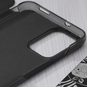 Pouzdro je navrženo v klasické černé barvě s jemnou, ale výraznou texturou, která dodává povrchu sofistikovaný vzhled a příjemný pocit na dotek. Jeho design typu "flip" chrání jak záda, tak displej telefonu. Přední strana pouzdra disponuje průhledným vertikálním pruhem, který umožňuje rychlý náhled na důležité informace, jako je čas, aniž byste museli pouzdro otevírat. Díky promyšlené konstrukci lze pouzdro snadno složit do praktického stojánku, což oceníte při sledování videí nebo videohovorech. Precizní výřezy pro fotoaparát a ostatní porty zajišťují plnou funkčnost zařízení.