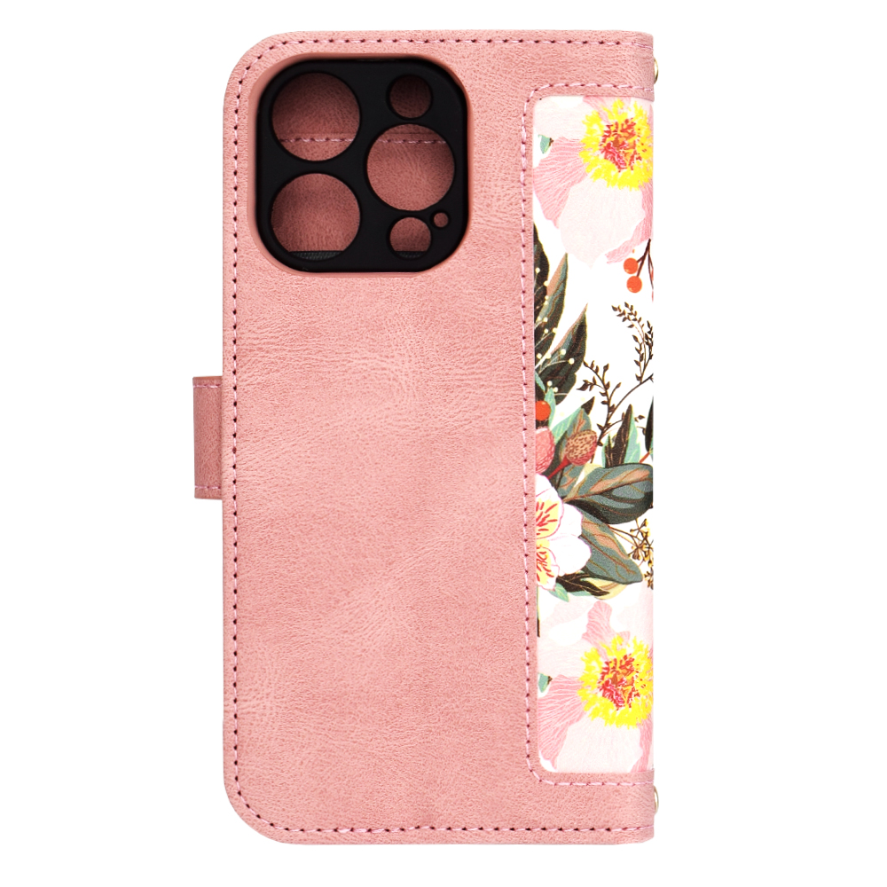 Pouzdro se pyšní jemnou růžovou barvou, která dodává vašemu telefonu sofistikovaný a ženský vzhled. Vnější strana je vyrobena z kvalitní syntetické kůže s decentní texturou, která je příjemná na dotek a zároveň odolná proti běžnému opotřebení. Vnitřní strana flipového krytu je zdobena nádherným květinovým vzorem s motivy růžových, žlutých a bílých květů doplněných zelenými listy a drobnými oranžovými plody, což pouzdru dodává jedinečný a svěží charakter. Pouzdro je precizně prošité po okrajích, což zvyšuje jeho odolnost a estetickou hodnotu.