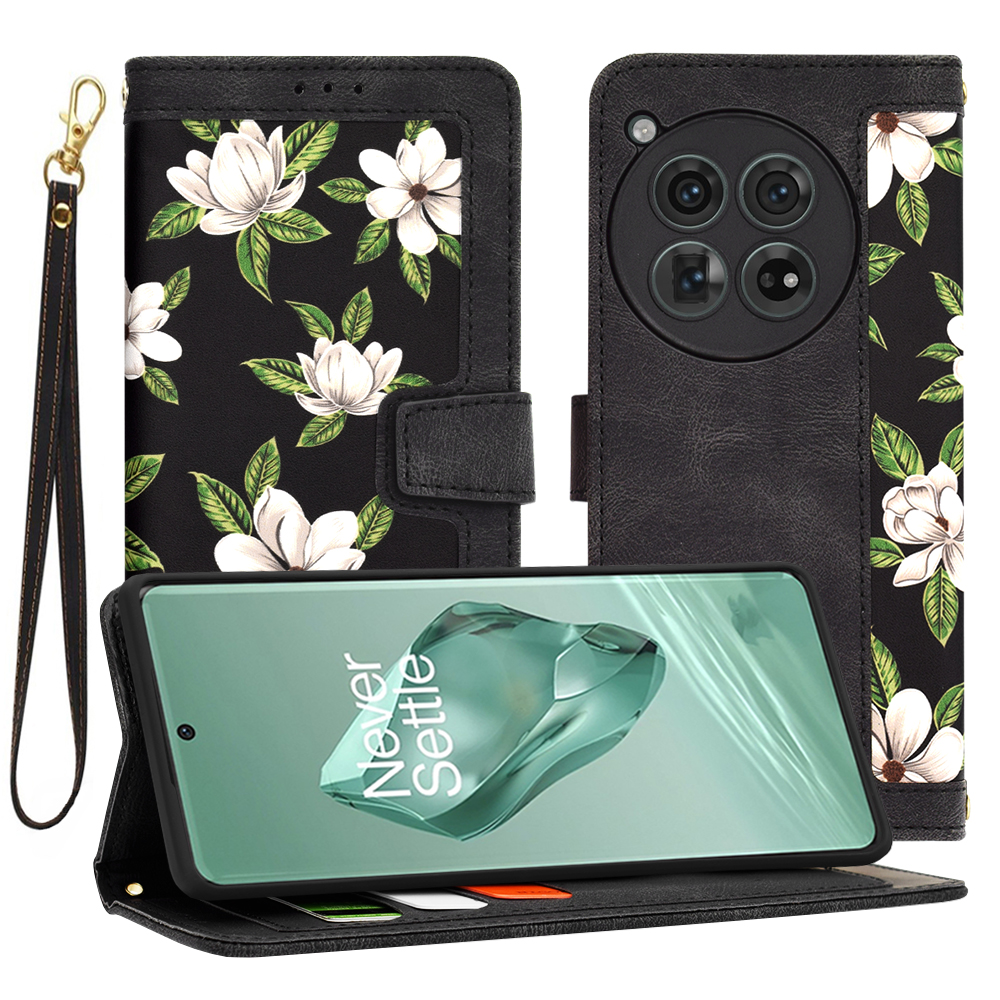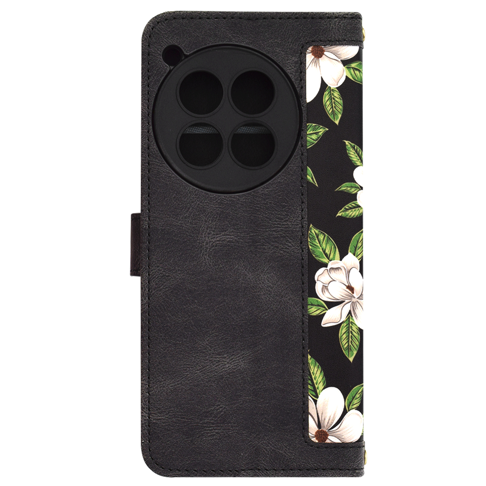 Pouzdro se pyšní sofistikovaným designem s motivem "Flowers of the Dawn", který je tvořen nádhernými bílými květy s jemnými zelenými lístky na elegantním černém pozadí. Tento vzor se opakuje na přední i zadní straně flipového krytu, což vytváří harmonický a poutavý vzhled. Vnější část pouzdra je vyrobena z kvalitní umělé kůže v černé barvě, která dodává produktu luxusní dojem a je příjemná na dotek. Precizní šití po okrajích zajišťuje dlouhou životnost a odolnost. Pouzdro je vybaveno praktickým magnetickým zavíráním, které spolehlivě drží přední flip na místě a chrání displej vašeho telefonu. Uvnitř pouzdra naleznete praktické přihrádky na karty nebo bankovky, což z něj činí ideálního společníka pro každodenní nošení. Nechybí ani výřez pro fotoaparát, který je přesně navržen pro model OnePlus 12, a umožňuje tak bezproblémové fotografování bez nutnosti vyjímání telefonu z pouzdra. Součástí balení je i praktické poutko na zápěstí pro ještě bezpečnější manipulaci.