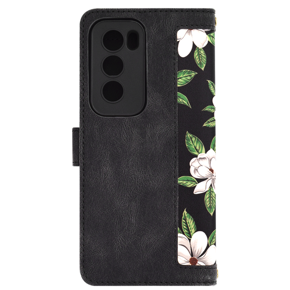 Obal se pyšní sofistikovaným designem s motivem "Flowers of the Dawn", který je charakterizován něžnými bílými květy s výraznými zelenými listy, rozprostřenými na elegantním černém podkladu. Tento květinový vzor dodává obalu svěží a nadčasový vzhled. Vnější strana obalu je vyrobena z materiálu imitujícího kůži, což zajišťuje příjemný pocit na dotek a zároveň zvyšuje jeho odolnost. Precizní šití a magnetické zapínání podtrhují kvalitní zpracování a zajišťují bezpečné uzavření. Součástí je také praktické poutko na zápěstí pro snadné a bezpečné přenášení.