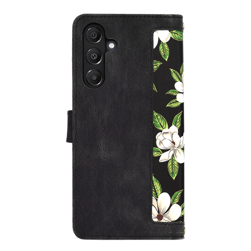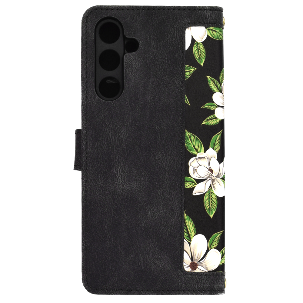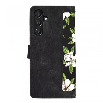 Pouzdro se pyšní sofistikovaným designem s motivem bílých květin a svěžích zelených listů, které kontrastují s elegantním černým podkladem. Tento vzor dodává pouzdru jemný, ale výrazný vzhled. Je vyrobeno z kvalitní syntetické kůže, která je příjemná na dotek a zajišťuje dlouhou životnost. Praktické magnetické zavírání udržuje pouzdro bezpečně zavřené, zatímco odnímatelný řemínek na zápěstí zvyšuje komfort a bezpečnost při nošení. Uvnitř pouzdra naleznete praktické přihrádky na karty a bankovky, což z něj činí ideálního společníka pro každodenní použití. Telefon je pevně uchycen v měkkém silikonovém lůžku, které absorbuje nárazy a chrání hrany zařízení.