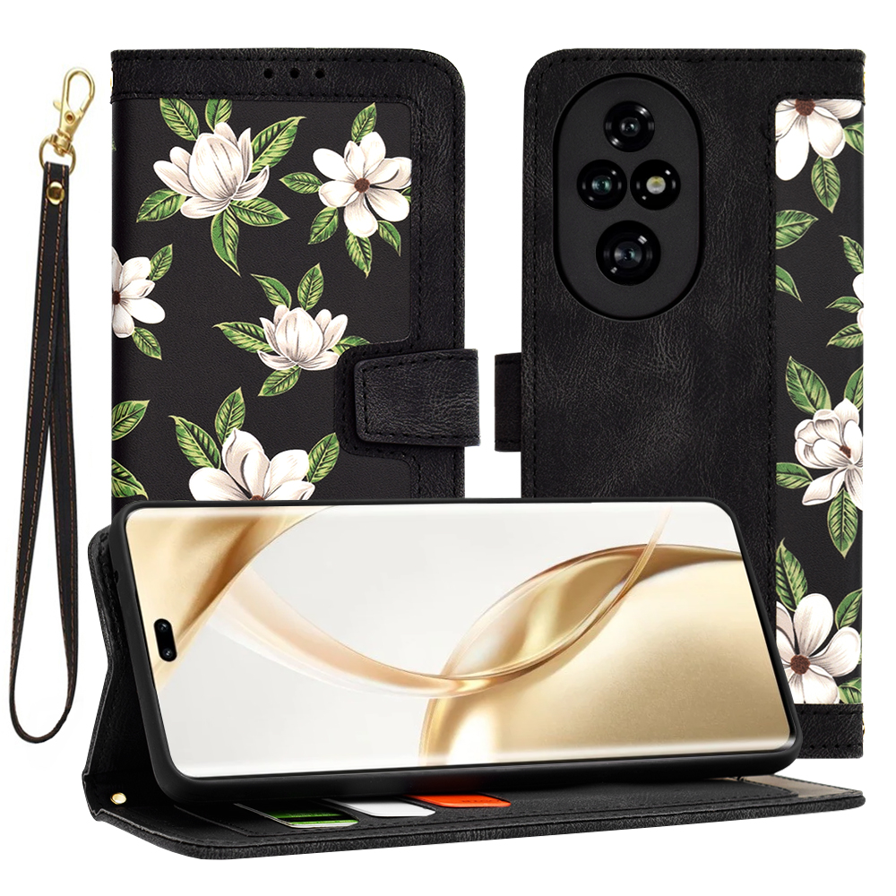 Pouzdro se pyšní sofistikovaným černým základem, který je zdoben nádherným vzorem bílých květů s jemnými zelenými lístky. Tento motiv dodává pouzdru svěží a zároveň elegantní vzhled, který upoutá pozornost. Vnitřní strana pouzdra je rovněž v černé barvě a nabízí praktické přihrádky na platební karty či doklady, což z něj činí ideálního společníka pro každodenní nošení.
