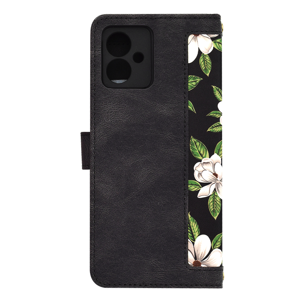 Pouzdro se pyšní motivem „Květy úsvitu“, který je zobrazen na tmavém, elegantním pozadí. Dominantní jsou bílé květy s jemnými zelenými lístky, které vytvářejí kontrastní a svěží vzhled. Vnější strana pouzdra je vyrobena z kvalitní syntetické kůže s jemnou texturou, která zajišťuje příjemný pocit na dotek a odolnost proti opotřebení. Vnitřní strana nabízí praktické přihrádky na karty a bankovky, což z pouzdra činí multifunkčního společníka pro každý den. Pouzdro je vybaveno magnetickým zavíráním pro bezpečné uchycení a odnímatelným poutkem na zápěstí pro snadné a bezpečné nošení.