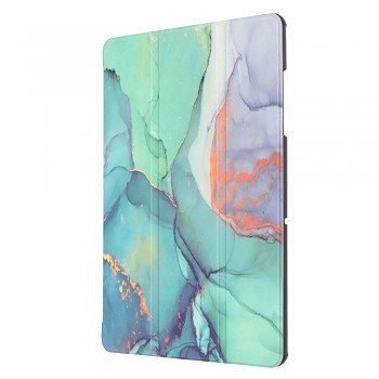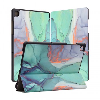 Pouzdro Techsuit FoldPro Green Time se pyšní originálním a poutavým designem, který okamžitě upoutá pozornost. Jeho povrch zdobí abstraktní vzor, kde se prolínají odstíny svěží zelené, tyrkysové a jemné modré, doplněné o výrazné akcenty měděné a oranžové barvy. Tento unikátní motiv připomíná fluidní umění nebo přírodní minerály, což dodává pouzdru luxusní a moderní vzhled. Černý rámeček pouzdra elegantně kontrastuje s barevným vzorem a zároveň zajišťuje bezpečné uchycení tabletu.