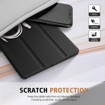 Design a materiály: Pouzdro Techsuit FoldPro se vyznačuje štíhlým a lehkým profilem, který nepřidává tabletu zbytečný objem. Vnější strana je vyrobena z materiálu s jemnou texturou, připomínající kůži, což dodává pouzdru profesionální a elegantní vzhled. Vnitřní strana je opatřena měkkou mikrovláknovou podšívkou, která chrání displej před poškrábáním a otisky. Zadní část tvoří kompaktní PC skořepina, která zajišťuje přesné uchycení a stabilitu.