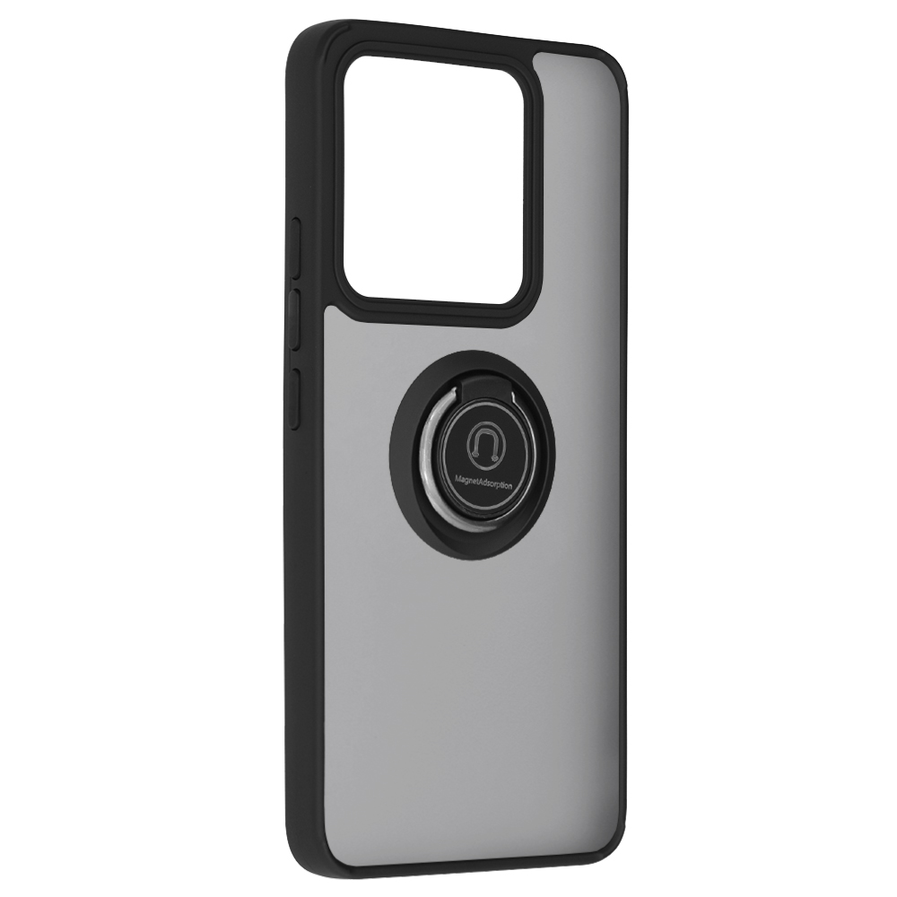 Pouzdro Techsuit Glinth pro Xiaomi 14T v elegantní černé barvě kombinuje robustní ochranu s moderním vzhledem. Jeho design se vyznačuje dvoubarevnou konstrukcí s černými, zesílenými okraji, které efektivně absorbují nárazy, a poloprůhlednou šedou zadní stranou, která decentně odhaluje původní design telefonu. Dominantním prvkem je integrovaný kovový kroužek na zadní straně, který slouží pro magnetickou adsorpci (kompatibilní s MagSafe příslušenstvím) a zároveň jako praktický stojánek pro pohodlné sledování obsahu. Precizní výřezy pro fotoaparát a všechny porty zajišťují plnou funkčnost zařízení bez nutnosti pouzdro sundávat.