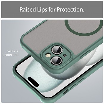 Pouzdro Techsuit HaloFrost II MagSafe se pyšní moderním a minimalistickým designem. Zadní strana je vyrobena z průsvitného, matného materiálu, který decentně odhaluje původní barvu vašeho telefonu a zároveň zabraňuje ulpívání otisků prstů. Dominantním prvkem je integrovaný MagSafe kroužek v tmavě zelené barvě, který zajišťuje perfektní kompatibilitu s MagSafe příslušenstvím a bezdrátovým nabíjením. Okraje pouzdra, včetně precizního výřezu pro modul fotoaparátu, jsou v sytě zeleném odstínu, který dodává pouzdru sofistikovaný vzhled. Zvýšené okraje kolem displeje a fotoaparátu poskytují extra ochranu proti poškrábání a nárazům.