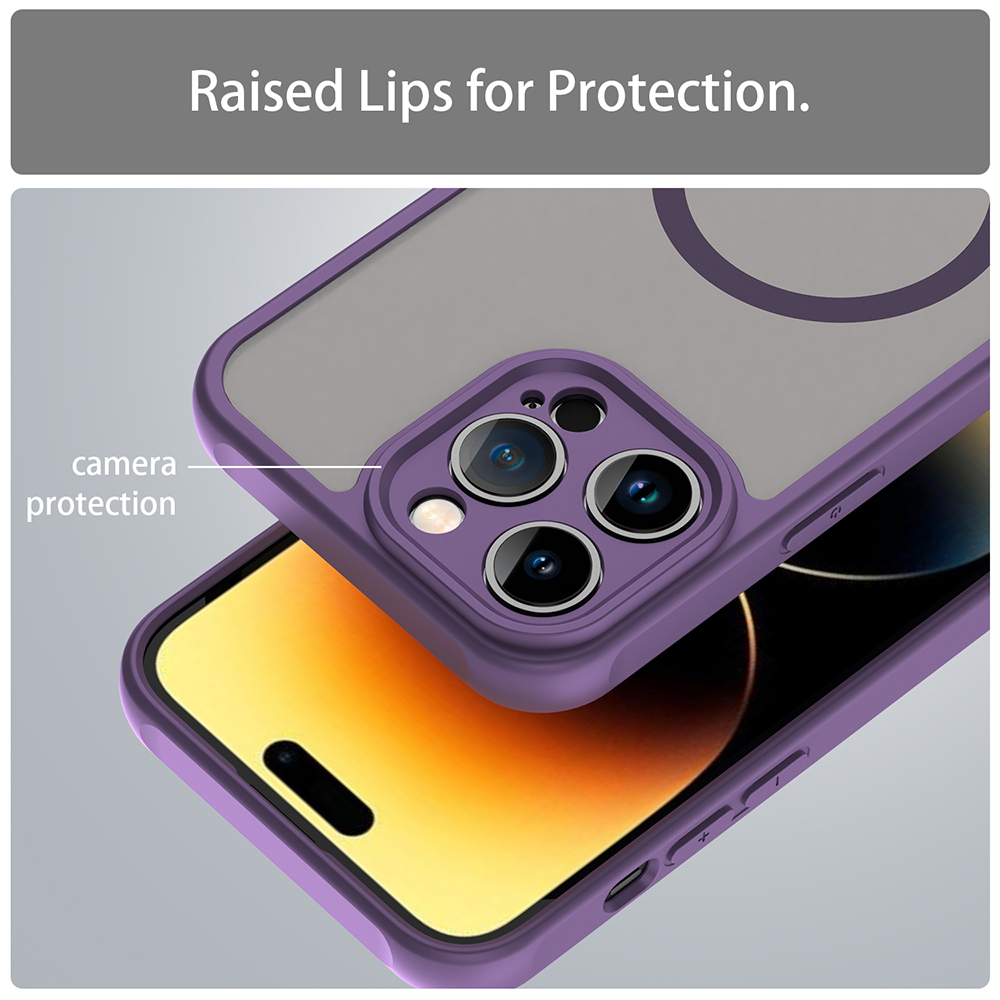 Pouzdro Techsuit HaloFrost II MagSafe se pyšní promyšleným designem, který klade důraz na funkčnost i estetiku. Jeho okraje a oblast kolem fotoaparátu jsou vyvedeny v sytě fialovém odstínu, který elegantně kontrastuje s průsvitnou matnou zadní stranou. Tato zadní strana je navržena tak, aby byla odolná proti mastnotě a vodě, což zajišťuje její dlouhotrvající čistotu a svěží vzhled. Integrovaný MagSafe kroužek na zadní straně zaručuje bezproblémovou kompatibilitu s MagSafe příslušenstvím a rychlé bezdrátové nabíjení.