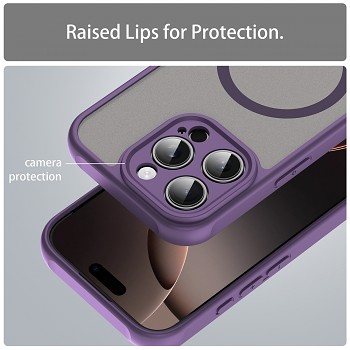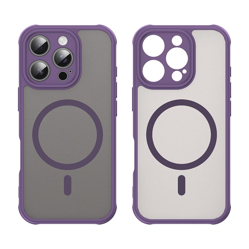 Kryt Techsuit HaloFrost II MagSafe se pyšní moderním a funkčním designem. Jeho zadní strana je vyrobena z průsvitného matného materiálu v elegantní šedé barvě, který decentně odhaluje logo Apple a zároveň zabraňuje ulpívání otisků prstů. Okraje krytu a detailní rámeček kolem fotoaparátu jsou provedeny v syté fialové barvě, která dodává celku šmrnc a sofistikovanost. Integrovaný MagSafe kroužek je viditelně zvýrazněn, což zajišťuje bezproblémovou kompatibilitu s MagSafe příslušenstvím a rychlé bezdrátové nabíjení. Přesné výřezy pro konektory, reproduktory a mikrofony, spolu s citlivými tlačítky, garantují plnou funkčnost vašeho zařízení bez jakýchkoli kompromisů.