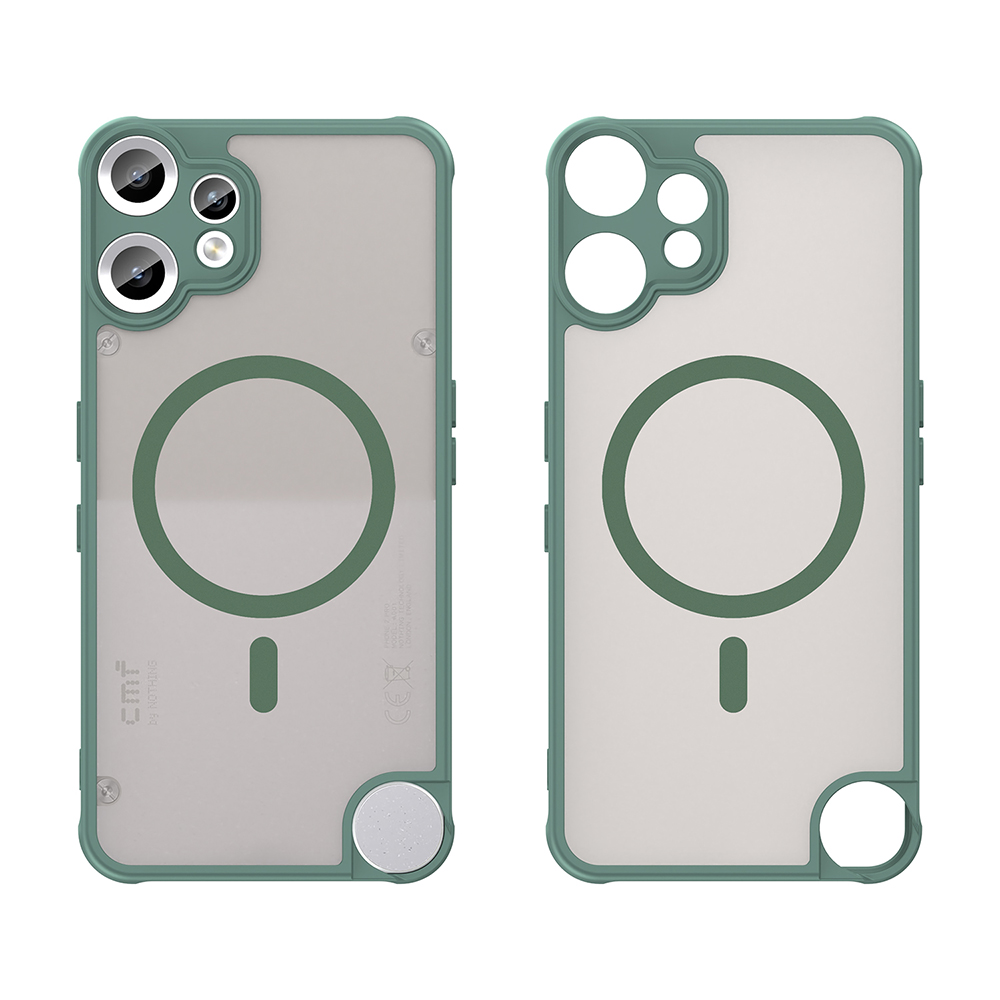 Pouzdro HaloFrost II MagSafe se vyznačuje transparentní zadní stranou, která nechává vyniknout originální design vašeho telefonu, zatímco robustní zelené okraje poskytují spolehlivou ochranu proti nárazům a pádům. Integrovaný zelený MagSafe kroužek zajišťuje pevné a stabilní připojení veškerého MagSafe příslušenství, od bezdrátových nabíječek po peněženky. Precizní výřezy pro fotoaparáty jsou zvýrazněny zeleným rámečkem, který dokonale doplňuje celkový vzhled. Na zadní straně je také viditelné logo "CMF BY NOTHING" a zajímavý kruhový prvek v pravém dolním rohu, který dodává pouzdru jedinečný charakter. Všechny ovládací prvky a porty jsou snadno přístupné díky přesnému zpracování, a tlačítka si zachovávají svůj jistý stisk.