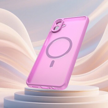 Design pouzdra je charakteristický svým průsvitným zadním panelem, který nechává vyniknout originální vzhled vašeho telefonu, zatímco pevné růžové okraje poskytují zvýšenou ochranu proti nárazům a pádům. Integrovaný MagSafe kroužek na zadní straně zajišťuje kompatibilitu s MagSafe příslušenstvím, což umožňuje snadné a bezpečné připevnění nabíječek nebo držáků. Pouzdro je vyrobeno z flexibilního materiálu, pravděpodobně TPU, který zaručuje snadnou instalaci a pohodlné držení. Precizní výřezy pro fotoaparát, tlačítka hlasitosti a napájení, stejně jako pro nabíjecí port a reproduktory, zajišťují plnou funkčnost telefonu bez nutnosti pouzdro sundávat.