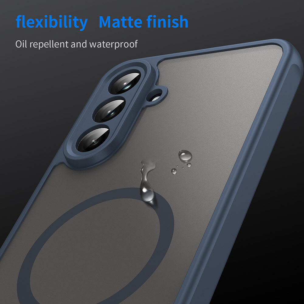 Kryt HaloFrost II MagSafe se pyšní sofistikovaným designem, který dokonale doplňuje linie vašeho telefonu. Jeho tmavě modrý rám z odolného materiálu zajišťuje spolehlivou ochranu hran a rohů, zatímco průsvitná, matně mrazivá zadní strana dodává moderní a minimalistický vzhled. Díky této kombinaci je logo telefonu decentně viditelné, zatímco povrch je odolný proti otiskům prstů a drobným škrábancům. Integrovaný MagSafe kroužek v tmavě šedé barvě nejen podtrhuje estetiku, ale zároveň zajišťuje bezproblémovou kompatibilitu s MagSafe příslušenstvím, což otevírá nové možnosti pro nabíjení a držáky. Přesné zpracování zaručuje perfektní padnutí a snadný přístup ke všem funkcím telefonu.