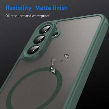 Pouzdro Techsuit HaloFrost II MagSafe se pyšní moderním a funkčním designem. Jeho zadní strana má průsvitný, matný a mrazivý povrch, který je nejen příjemný na dotek, ale také odolný proti otiskům prstů, mastnotě a vodě. Zelený rámeček pouzdra elegantně doplňuje celkový vzhled a dodává mu sofistikovaný nádech. Integrovaný MagSafe kroužek na zadní straně zajišťuje bezproblémovou kompatibilitu s MagSafe příslušenstvím a bezdrátovým nabíjením.