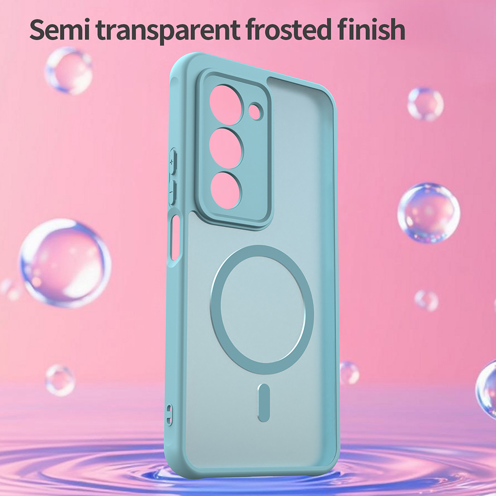 Pouzdro HaloFrost II MagSafe se pyšní moderním a minimalistickým designem. Jeho zadní strana je vyrobena z průsvitného materiálu s matným povrchem, který elegantně odhaluje původní design telefonu, zatímco integrovaný MagSafe kroužek zajišťuje bezproblémovou kompatibilitu s MagSafe příslušenstvím a bezdrátovým nabíjením. Okraje pouzdra v osvěžující mátově zelené barvě jsou vyrobeny z odolného TPU materiálu, který poskytuje vynikající ochranu proti nárazům a pádům. Zvýšené okraje kolem displeje a precizní výřez pro modul fotoaparátu efektivně chrání čočky před poškrábáním a poškozením. Pouzdro je navrženo tak, aby dokonale obepínalo křivky vašeho telefonu, aniž by přidávalo zbytečný objem, a zároveň poskytovalo pohodlný a jistý úchop.