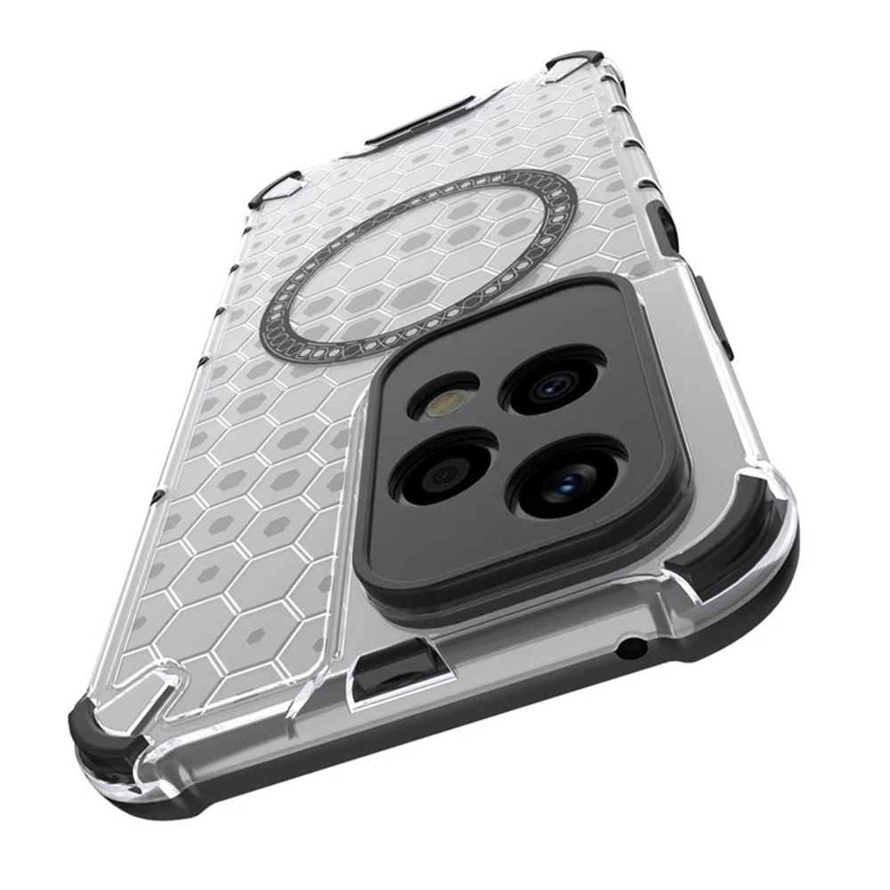 Pouzdro Techsuit HoneyComb Shield se vyznačuje promyšleným designem, který klade důraz na ochranu a estetiku. Zadní strana je tvořena transparentním materiálem s výrazným voštinovým (honeycomb) vzorem, který nejen skvěle vypadá, ale také přispívá k lepšímu rozložení nárazů. Dominantním prvkem je integrovaný černý MagSafe kroužek, elegantně ohraničený drobnými bílými tečkami, který zajišťuje bezpečné a stabilní připojení MagSafe příslušenství.