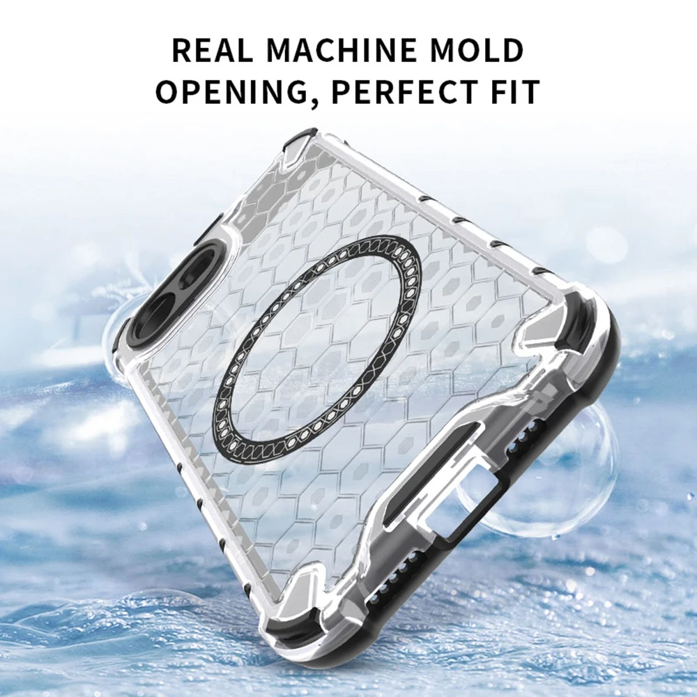 Kryt Techsuit HoneyComb Shield MagSafe se pyšní transparentním zádovým panelem s unikátním voštinovým (honeycomb) vzorem, který nejen skvěle vypadá, ale také přispívá k lepší absorpci nárazů. Dominantním prvkem je integrovaný MagSafe kroužek, elegantně ohraničený drobnými tečkami, který zajišťuje perfektní kompatibilitu s MagSafe příslušenstvím a bezdrátovým nabíjením.