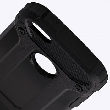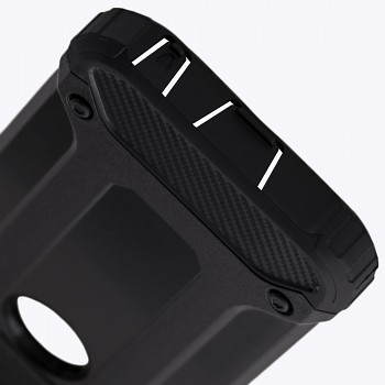 Tento kryt je navržen jako dvouvrstvá ochrana, skládající se z vnitřní vrstvy z měkkého TPU (termoplastického polyuretanu) a vnějšího pláště z tvrdého PC (polykarbonátu). Tato kombinace materiálů zajišťuje efektivní tlumení nárazů a ochranu proti pádům, poškrábání a každodennímu opotřebení. Design krytu je inspirován industriálním stylem s výraznými liniemi a texturou připomínající karbonová vlákna na horní a spodní části zadní strany. Černá barva dodává krytu nadčasový a sofistikovaný vzhled, který podtrhuje eleganci vašeho telefonu. Zvýšené okraje a plně pokryté hrany poskytují maximální ochranu displeje a fotoaparátu.