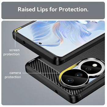 Pouzdro Techsuit Carbon Silicone se pyšní sofistikovaným vzhledem, který kombinuje matný povrch s jemnou kartáčovanou texturou na zadní straně, jež nejen skvěle vypadá, ale také účinně zabraňuje ulpívání otisků prstů. Horní a spodní část zadní strany, stejně jako okraje kolem modulu fotoaparátu, jsou zdobeny dynamickým vzorem imitujícím karbonová vlákna, což dodává pouzdru sportovní a luxusní nádech.