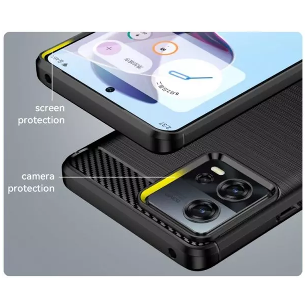 Pouzdro je vyrobeno z kvalitního silikonu, který zajišťuje odolnost proti nárazům a poškrábání. Jeho design kombinuje moderní estetiku s funkčností. Zadní strana pouzdra se pyšní jemnou texturou imitující broušený kov, která dodává telefonu sofistikovaný vzhled a zároveň zlepšuje úchop. Horní a spodní část zadní strany je doplněna karbonovou texturou, která podtrhuje sportovní a dynamický charakter pouzdra. Přesné výřezy pro fotoaparáty, konektory a reproduktory zaručují plnou funkčnost vašeho zařízení bez jakéhokoli omezení. Zvýšené okraje kolem displeje a fotoaparátu poskytují extra ochranu proti poškození při položení telefonu na rovnou plochu.