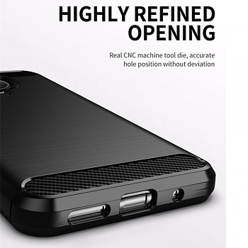 Pouzdro se pyšní sofistikovaným vzhledem, který kombinuje několik textur pro maximální estetický dojem a praktičnost. Horní a spodní část krytu zdobí karbonová textura, která dodává pouzdru sportovní a dynamický vzhled a zároveň zlepšuje úchop. Střední část je opatřena jemnou texturou imitující broušený kov, což přispívá k elegantnímu a minimalistickému vzhledu. Celý kryt je vyroben z kvalitního silikonu, který efektivně absorbuje nárazy a chrání telefon před poškrábáním a pády. Přesné výřezy zajišťují bezproblémový přístup ke všem konektorům, mikrofonům, reproduktorům a fotoaparátům, zatímco tlačítka si zachovávají svůj jistý stisk.