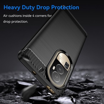 Pouzdro se pyšní sofistikovaným designem v černé barvě. Zadní strana je opatřena texturou imitující broušený kov, která dodává pouzdru prémiový vzhled a zároveň zlepšuje úchop. Horní a spodní část zadní strany je doplněna o elegantní karbonovou texturu, která nejenže vypadá stylově, ale také zvyšuje odolnost v nejvíce namáhaných místech. Přesné výřezy zajišťují bezproblémový přístup ke všem konektorům, mikrofonům, reproduktorům a fotoaparátům, aniž by omezovaly funkčnost telefonu. Tlačítka jsou krytá, ale zachovávají si jistý a příjemný stisk. Pouzdro je vyrobeno z kvalitního silikonu, který efektivně absorbuje nárazy a chrání telefon před poškrábáním a pády.