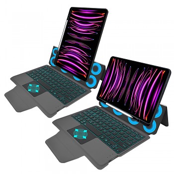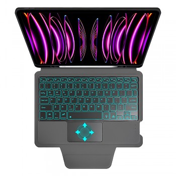Design pouzdra Techsuit KeyTab Pro je promyšlen do posledního detailu. Matně černý povrch působí minimalisticky a profesionálně. iPad je bezpečně usazen v pevném rámu, který chrání jeho hrany a rohy. Klávesnice je integrována do spodní části pouzdra a nabízí příjemný zdvih kláves pro komfortní psaní. Podsvícení kláves v modré barvě nejen skvěle vypadá, ale je i praktické. Trackpad je dostatečně velký pro plynulé ovládání a navigaci. Celý komplet se snadno složí do kompaktního tvaru, který chrání displej iPadu a zároveň usnadňuje přenášení.