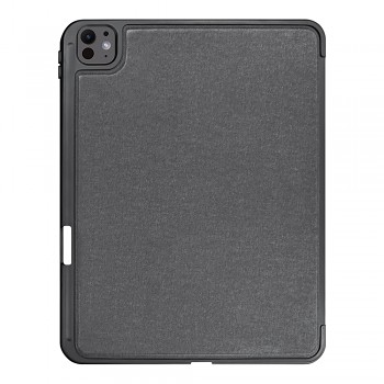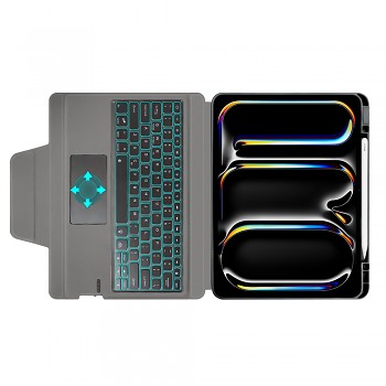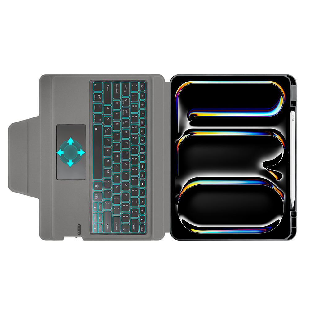 Design Techsuit KeyTab Pro se vyznačuje minimalistickým a sofistikovaným vzhledem v tmavě šedém až černém provedení. Váš iPad Pro je bezpečně usazen v pevném rámu, který zajišťuje komplexní ochranu proti nárazům a poškrábání. Zadní strana krytu je opatřena jemnou texturou, která dodává zařízení prémiový vzhled a příjemný pocit na dotek. Integrovaná klávesnice s nastavitelným RGB podsvícením nabízí komfortní psaní i za zhoršených světelných podmínek, zatímco přesný trackpad umožňuje intuitivní ovládání a zvyšuje vaši produktivitu. Díky promyšlené konstrukci lze kryt snadno složit do stabilního stojanu s několika úhly nastavení, což je ideální pro práci, sledování obsahu nebo videohovory. Nechybí ani praktický slot pro Apple Pencil, který zajišťuje, že vaše pero bude vždy po ruce a bezpečně uloženo.