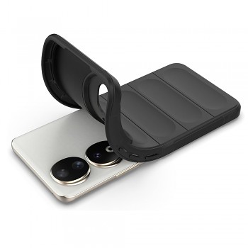 Kryt Techsuit Kouzelný štít se pyšní minimalistickým a zároveň robustním designem v matně černé barvě. Zadní strana je opatřena několika horizontálními, mírně vystouplými žebry, která nejenže dodávají krytu moderní vzhled, ale také zajišťují pevný a jistý úchop, čímž minimalizují riziko vyklouznutí telefonu z ruky. Tyto prvky zároveň přispívají k lepší absorpci nárazů. Kryt je precizně tvarován s vyvýšenými okraji, které chrání displej a modul fotoaparátu před přímým kontaktem s povrchem. Vnitřní strana krytu je opatřena reliéfem "DROP PROTECTION", což podtrhuje jeho zaměření na maximální ochranu proti pádům.