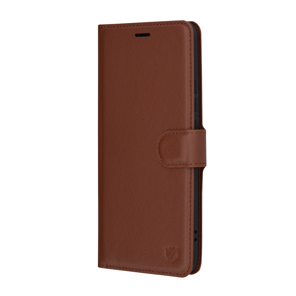 Pouzdro se pyšní sofistikovaným designem v teplém hnědém odstínu, který imituje texturu kůže a dodává telefonu luxusní vzhled. Jeho praktické provedení zahrnuje magnetické zapínání, které zajišťuje bezpečné uzavření a chrání displej, když telefon nepoužíváte. Uvnitř pouzdra naleznete integrované přihrádky na platební karty a větší kapsu na bankovky, což z něj činí ideálního společníka pro každodenní nošení, eliminující potřebu samostatné peněženky. Telefon je pevně usazen v precizně tvarované vnitřní vaničce, která zaručuje snadný přístup ke všem konektorům, tlačítkům a fotoaparátu, aniž by omezovala funkčnost zařízení. Navíc lze pouzdro složit do praktického stojánku, což oceníte při sledování videí nebo videohovorech.